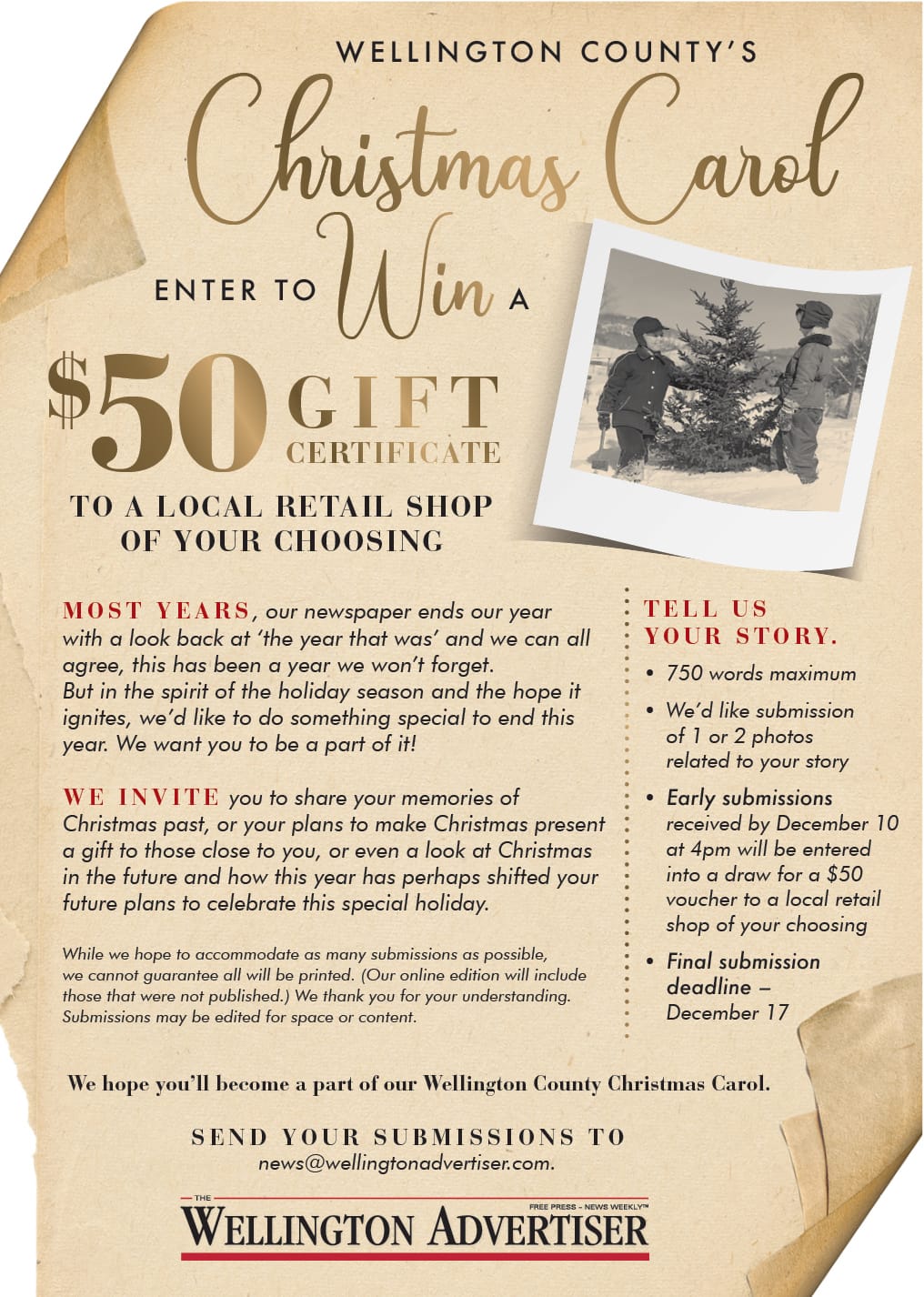 We know there are many good writers and people with fabulous stories that live in Wellington County. The idea we have is this: Share your story of Christmas(es) past, how you are handling the holidays this year and what you see going forward. More details below.