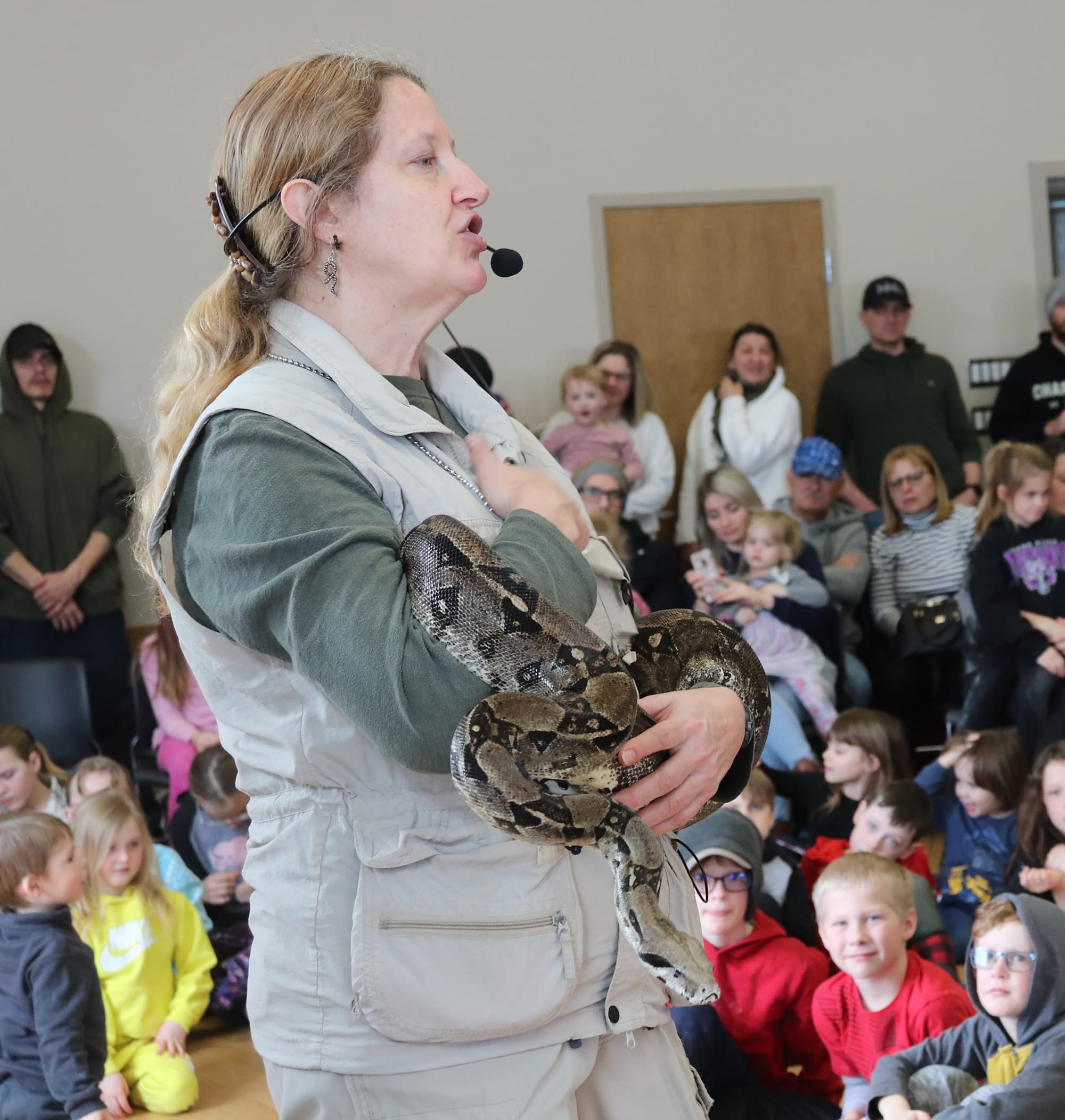 The audience was introduced to Ruby the garter snake, Dasani the northern water snake, Smokey the black rat snake, an endangered eastern fox snake, and a huge boa constrictor that wound around Pearce’s arms and shoulders while she talked.
