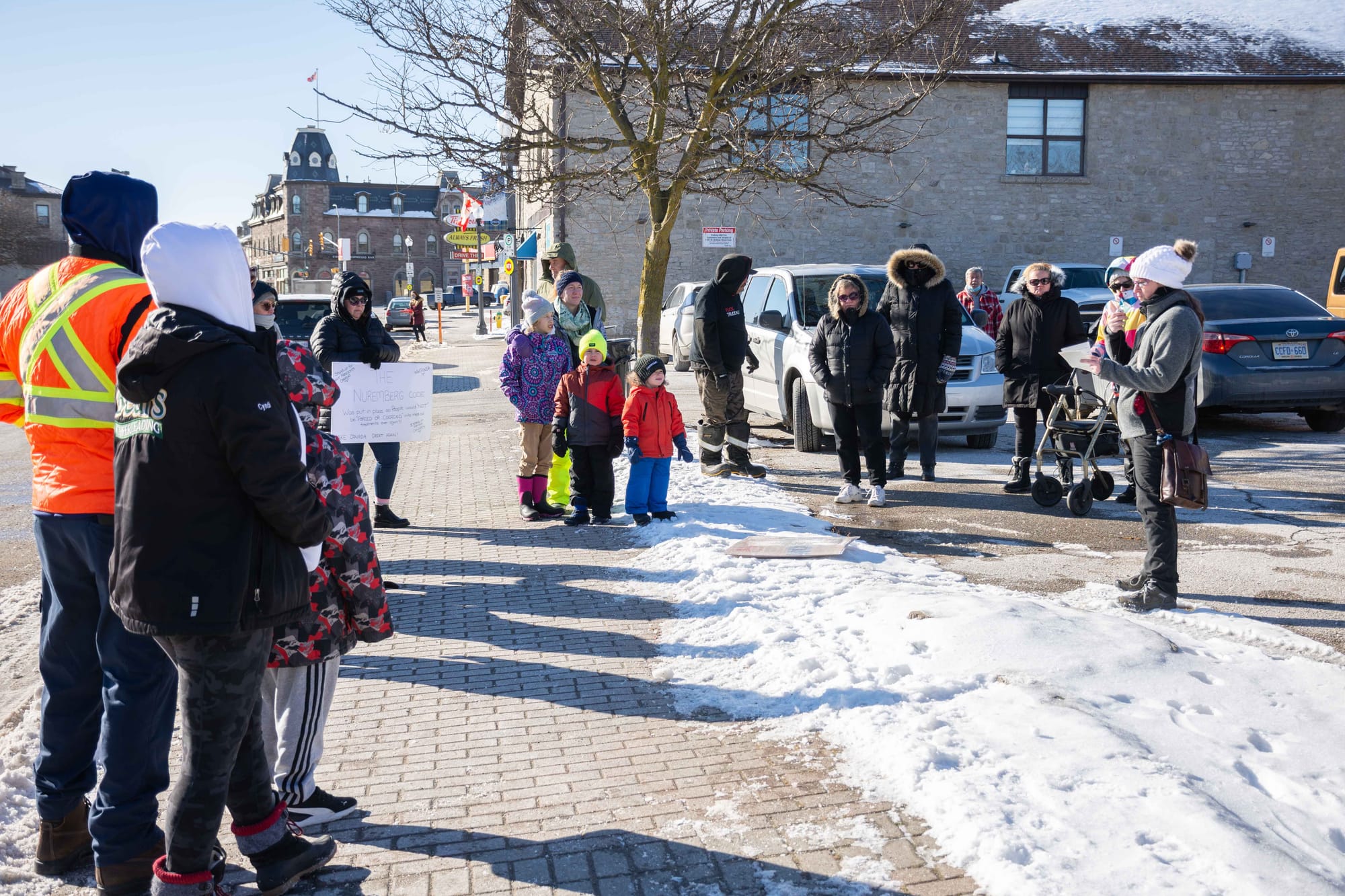 FERGUS — A small group of citizens gathered in a parking lot on St. Andrew Street in downtown Fergus on Jan. 14, for what was advertised on social media as a protest against government lockdown measures aimed at thwarting the spread of COVID-19.
