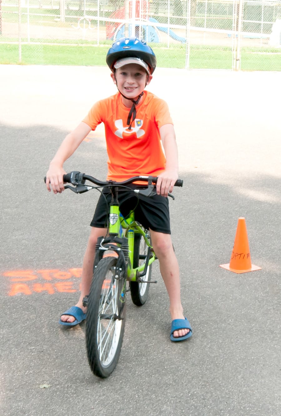 Bike rodeo - The Optimist Club Of Moorefield held its annual bike rodeo on Aug. 28 with almost 40 cyclists on hand. The rodeo was followed by a hotdog lunch and presentation of trophies for category winners and prizes for all participants. Organizers thanked C. Deen Electric for sponsoring the prizes and OPP Constable Campbell for assistance with the event. TOP: Rodeo winners, from left, were: Seth Ottens, Huck Bates, E.J. Kopf, Christine Grasman, Rachel Grasman and Karissa Poechman. BELOW: Brayden and Kaylan Saunders enjoying their well earned hot dogs. Micah Morgan practicing his skills on the course. Photos by Jennifer Goertzen