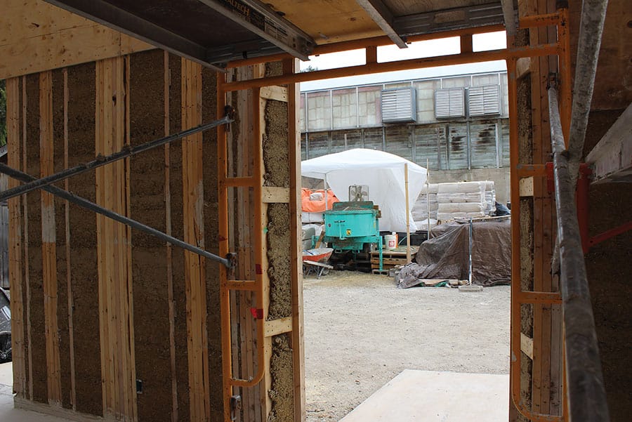 The process is simple – mix one part water, one part limestone, and one part sheared hemp shives (the woody stem of the plant). Then, shovel the mixture into forms for the walls and ceiling, tamp it down, and let it cure.