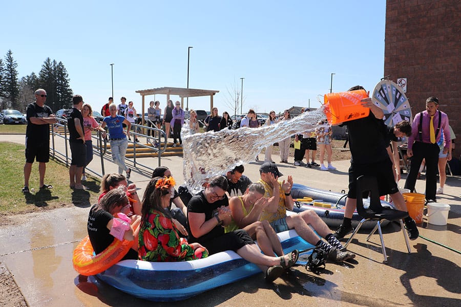 ‘Soak a teacher’ – Students at Centre Wellington District High School (CWDHS) had the opportunity to “soak a teacher” on April 14 to support the Canadian Cancer Society Relay For Life. The fundraiser culminates with an eight-hour relay at the school on May 26. Jack Webley, Grade 12, dumps a bucket of water on a group of educators. Photos by Makenna Polsterer