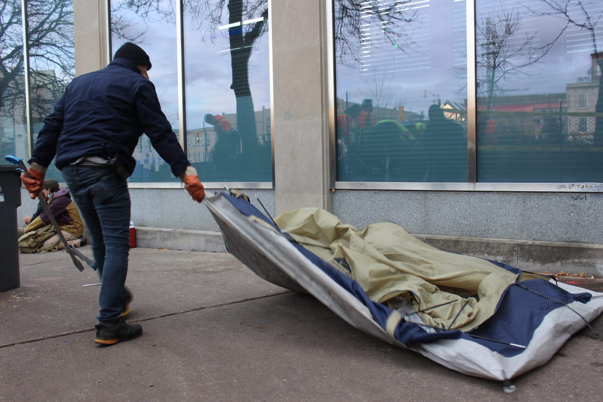 People scrambled to pack up and find safe places to store their things while city staff dragged tents away and unloaded dozens of evergreen shrubs to plant in the space.