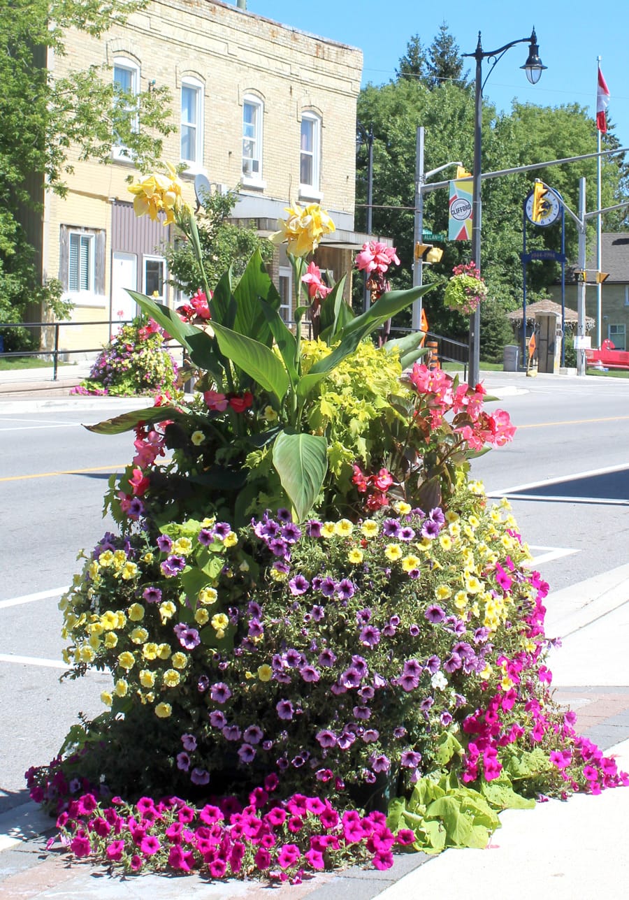 Town of Minto landscape manager Paul Judge and his crew have kept the hanging baskets and flower boxes thriving. The plants and flowers did take a beating in the recent storm that brought terrific winds, rain, and hail, but they survived and are still attracting compliments. Plantings are maintained at the post office, arena, community hall, fire hall, Rotary parks, cemeteries in Clifford and Lakelet, the Cenotaph park, and at the intersection at Kettles Restaurant as well as the flower boxes at the arena and the smaller flower boxes along Elora Street.
