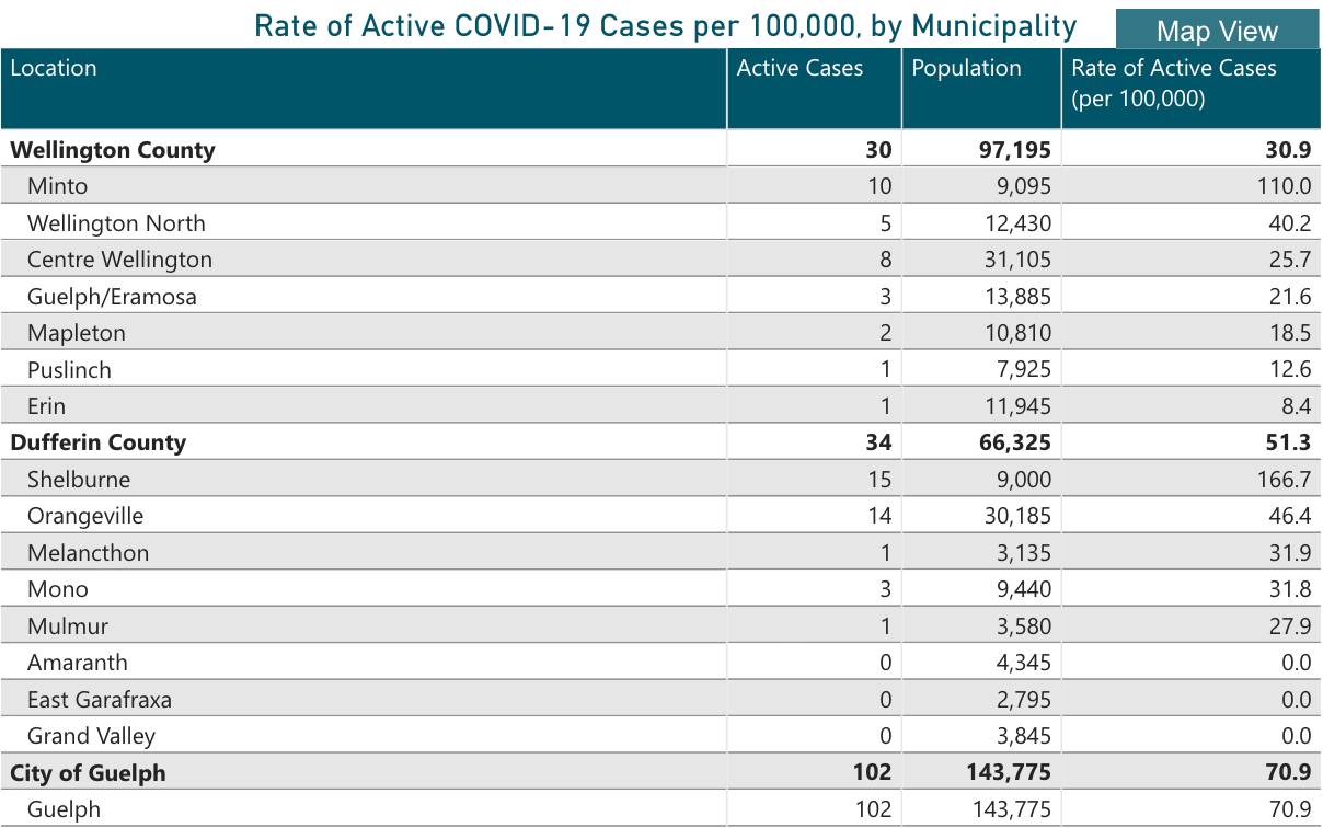 In Dufferin County there are 34 active cases (up from 27) and in Guelph there are 102 (down from 105).