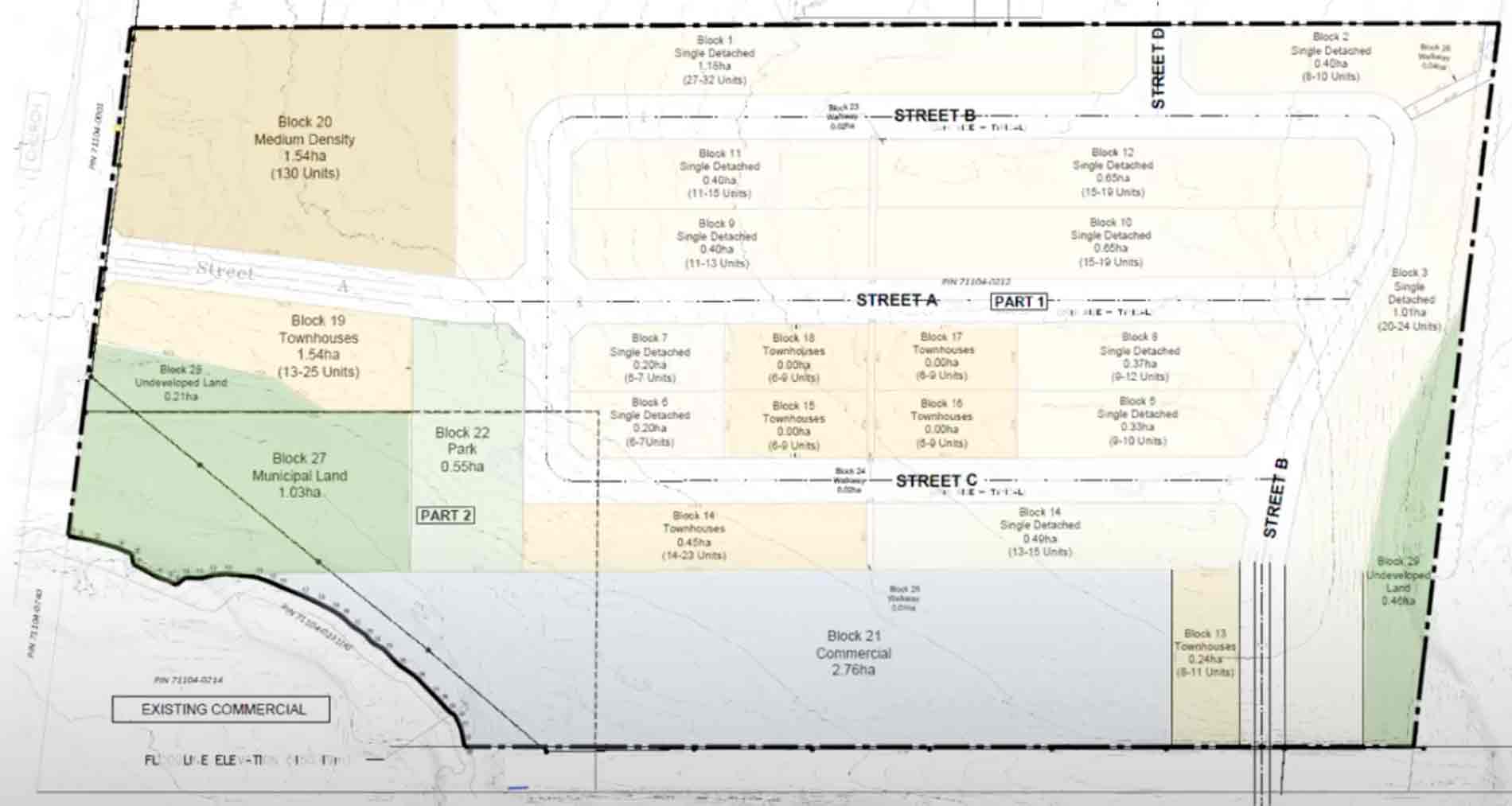 The proposal included up to 354 units, including two apartment buildings (up to six storeys), 155 detached homes and up to 69 townhouses as well as a commercial area on an 18 hectare (46 acre) lot at Wellington Road 109 and Eliza Street.