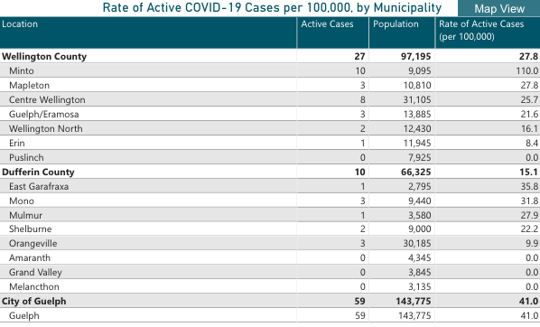 In Dufferin County there are 10 active cases (unchanged from last week) and in Guelph there are 59 (down from 80).