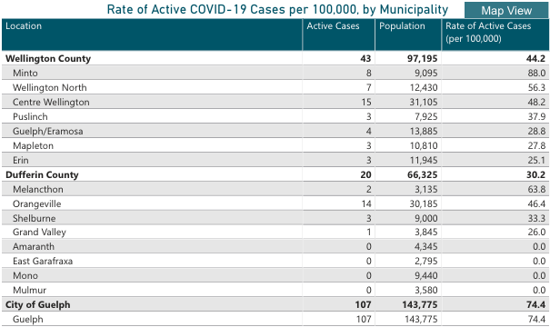 In Dufferin County there are 20 active cases (down from 27 on Sept. 21) and in Guelph there are 107 (up slightly from 103).