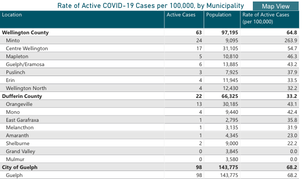 In Dufferin County there are 22 active cases (down from 28) and in Guelph there are 98 (up from 73).