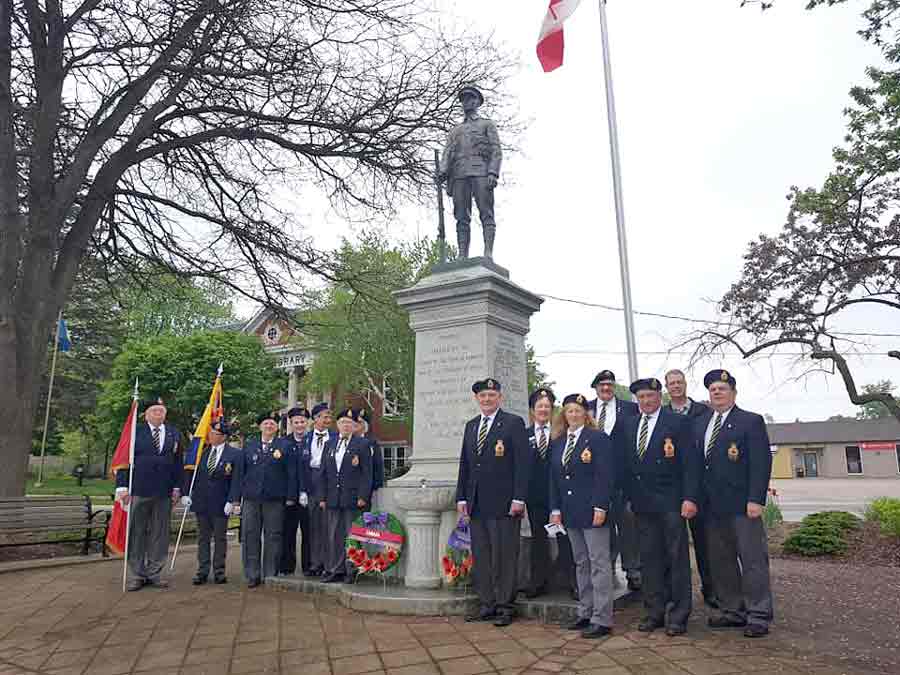 Wreaths were laid to recognize the D-Day anniversary and the 80th anniversary of Branch 296. Photo by Patrick RaftisD-Day 75th commemoration - Members of Royal Canadian Legion Branch 296, Harriston, held a ceremony at the local cenotaph commemorating the 75th Anniversary of D-Day on June 6. Submitted photo