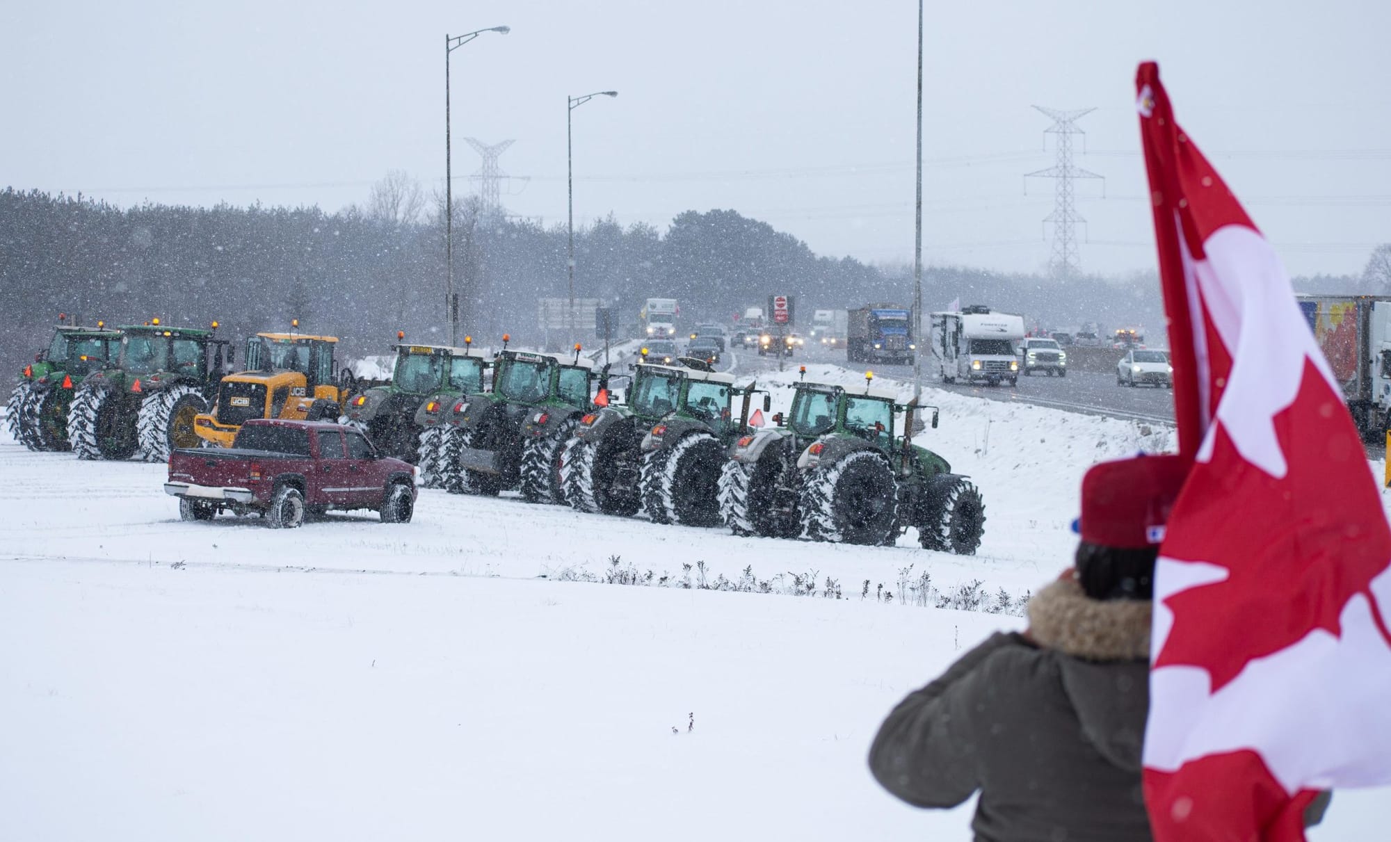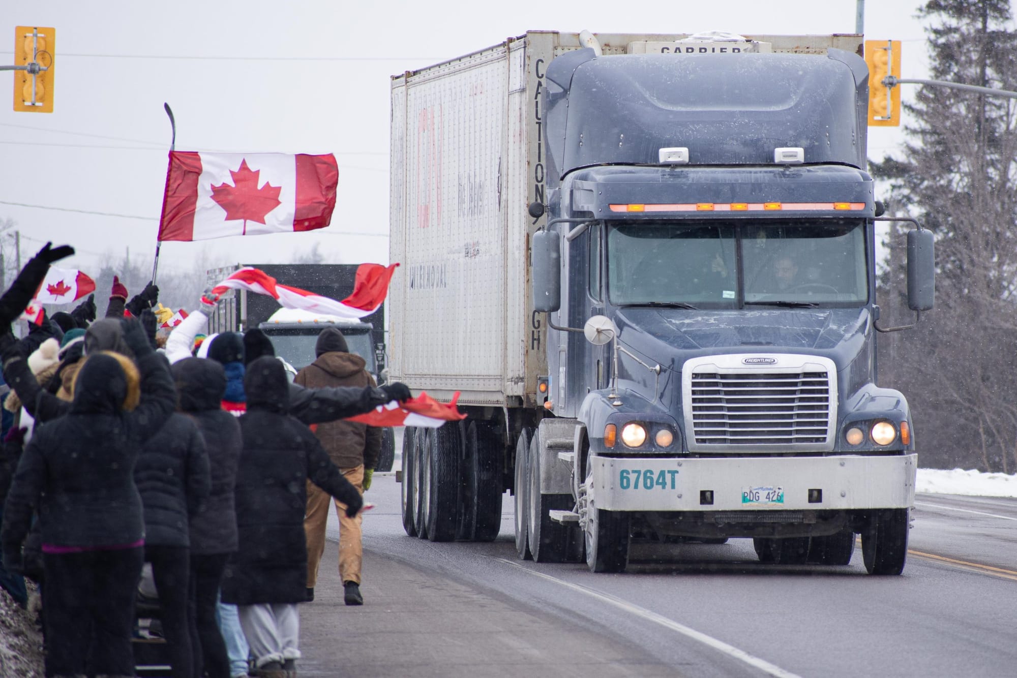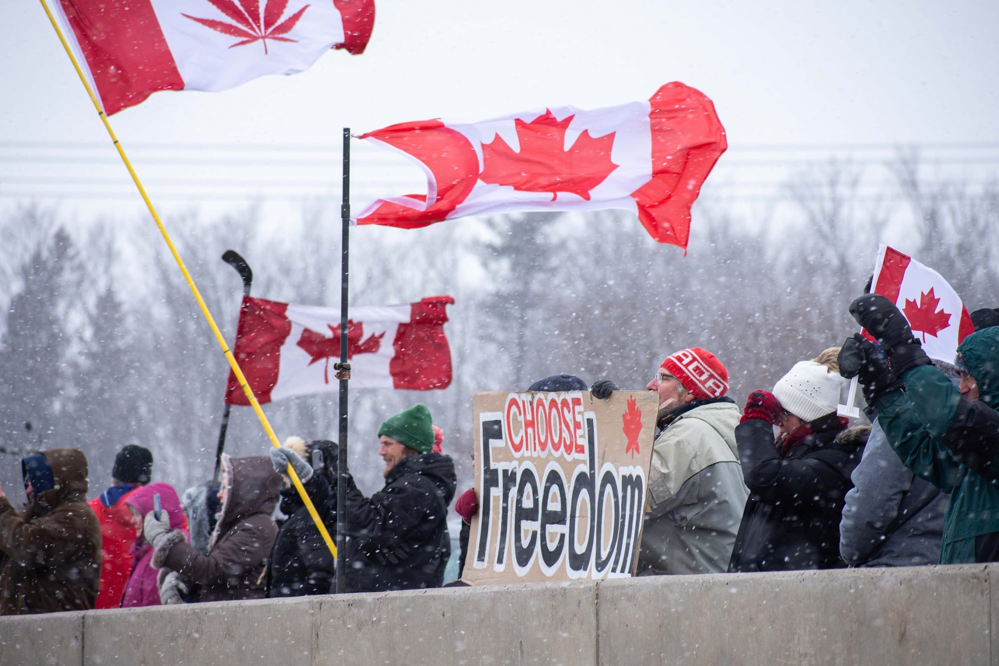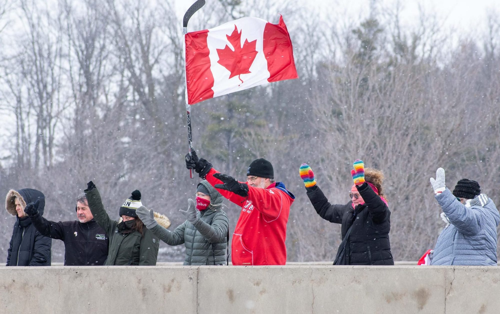 Canadian flags crackled in the biting wind as those gathered on the 401 overpass threw gloved fists in the air in response to the blaring horns. Children huddled close to parents who lined an adjacent snow-covered bank in an attempt to stay warm.