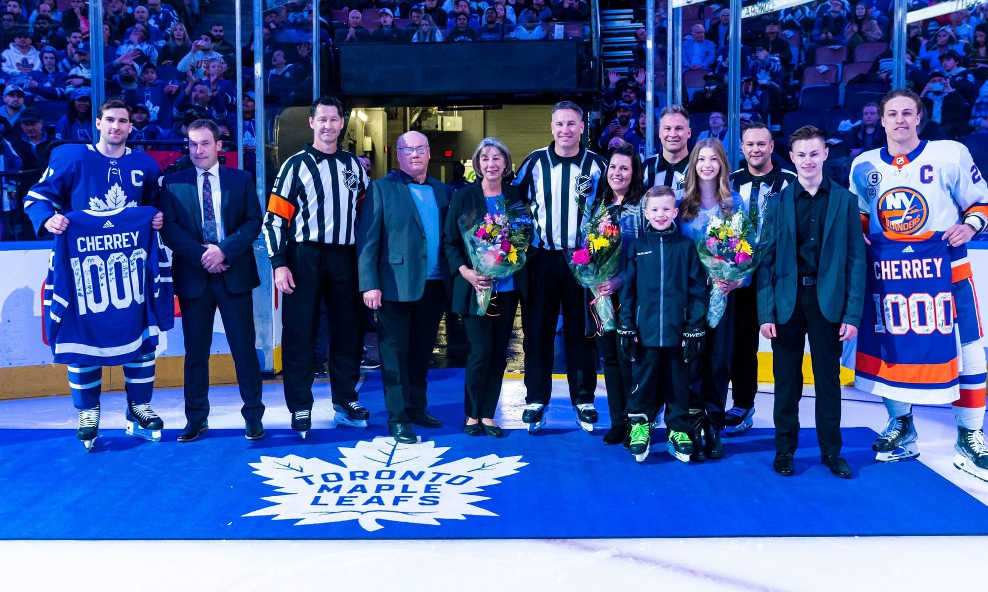 Cherrey was celebrating his 1,000th game calling the lines at hockey’s highest level and was the focus of a pre-game ceremony during which he was presented with a commemorative Tiffany crystal by Stephen Walkom, the NHL’s senior vice-president of officiating.