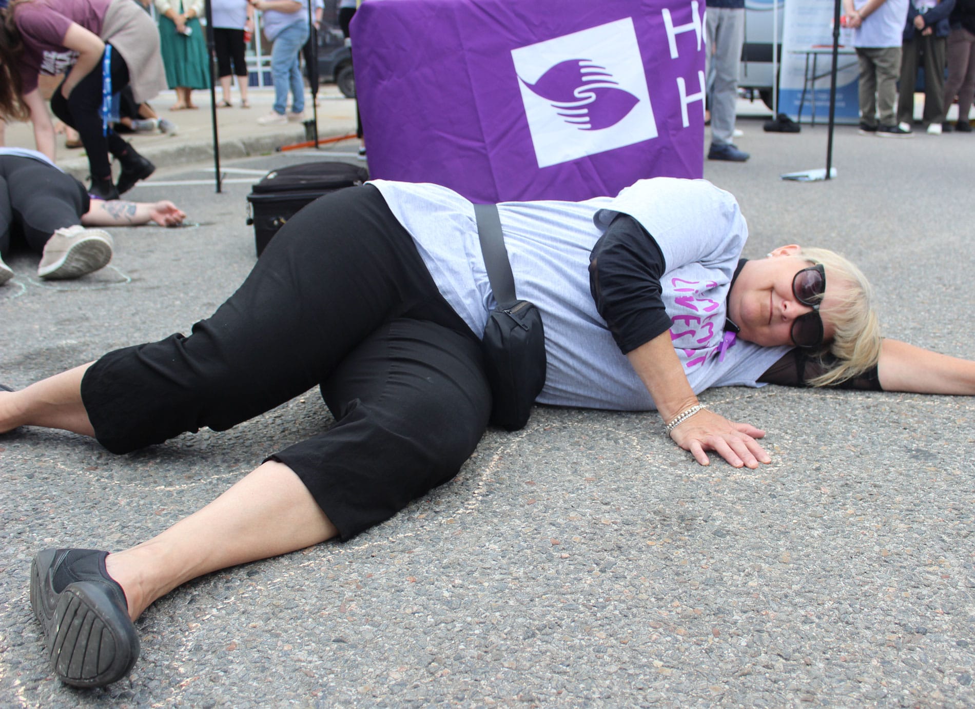 After a moment of silence, people took turns lying down on the road and sidewalk at King Street East, which was closed off for the event, and drawing chalk outlines around each other, something organizers called a “die-in.”