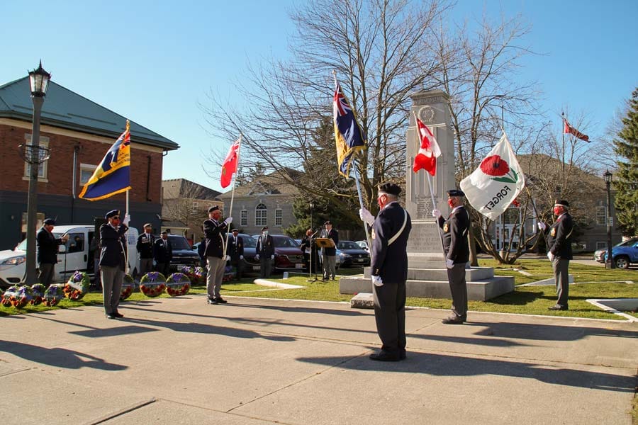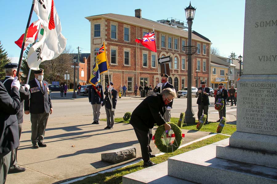 Showing respect - After the Remembrance Day service at the Elora cenotaph ended on Nov. 11, three year-old Ellie Bangay of Fergus added a poppy to one of the wreaths. Her mother, Justine, ensured she did so safely before the pair took time to look at the painted rocks on the cenotaph and appreciate the wreaths.