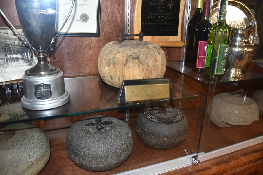 The club’s past plays a big part in the present. Traditions, such as being ushered on the ice by bagpipes at bonspiels, continue. And there are showcases in the lounge area that feature historic items, like a banner from 1899, old hand-made rocks, trophies and numerous photographs of past members.