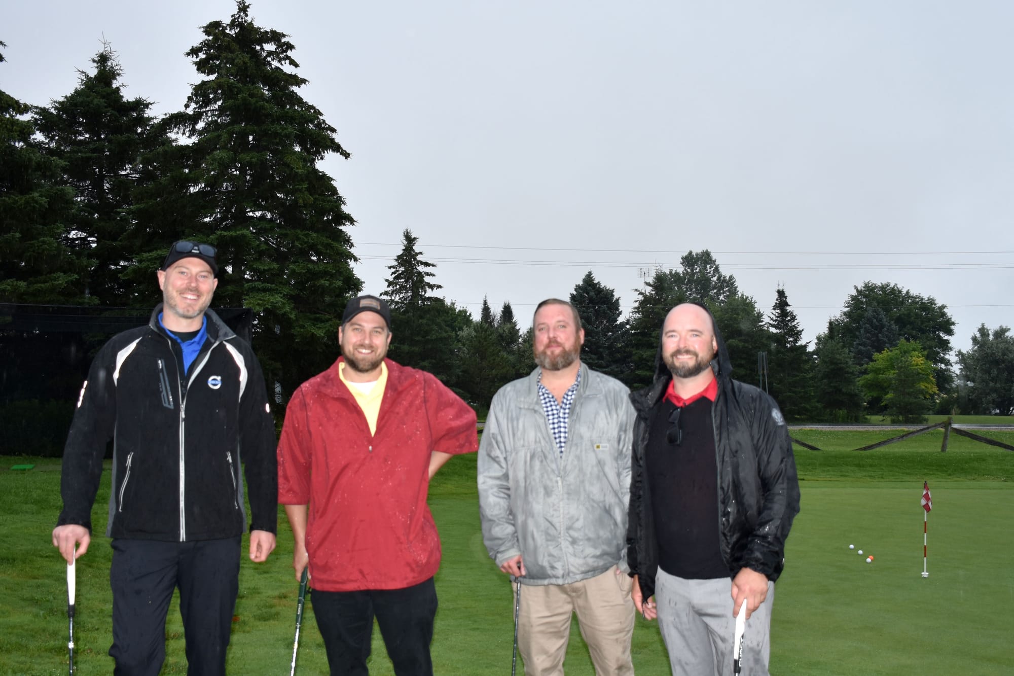 ABOVE: Golf for kids – Big Brothers and Big Sisters hosted its community fundraising event, Golf for Kids Sake, on July 8 at Wildwinds Golf Links. From left: student volunteer Meg Harron and board chair Pam Stumpf. BELOW: Drought dedication – golfers in the community braced the downpour to come out to the event. From left: MFC law group members Jason, Kyle, Andrew and Kevin. Photos by Paige Peacock