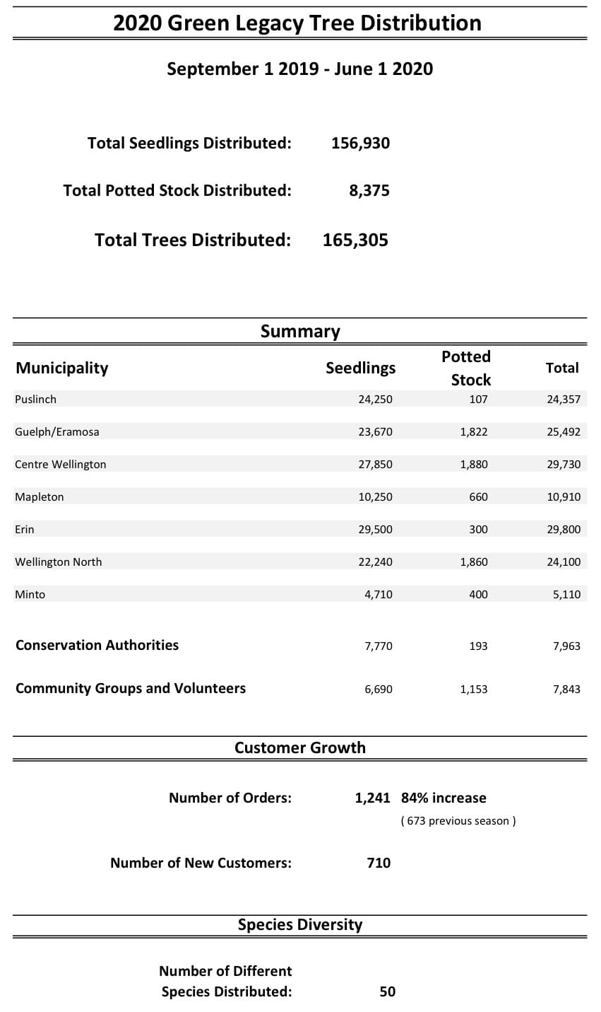 A breakdown of Green Legacy tree distribution for 2019-20 is included below.