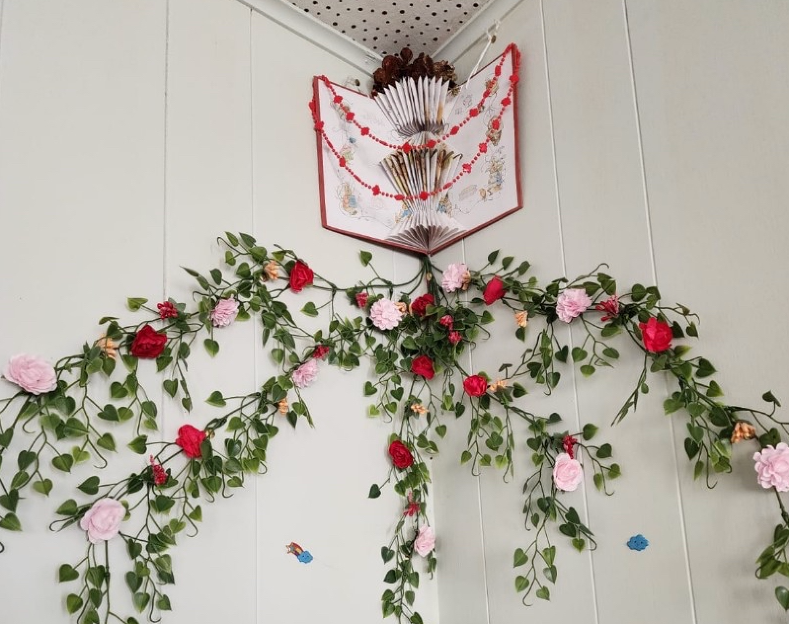 Nizal has decorated the room with her artwork – pieces of folded, decorative paper are fashioned into an unfurling centrefold in a book mounted on a corner wall with cascading vines carrying red, orange, and pink flowers.