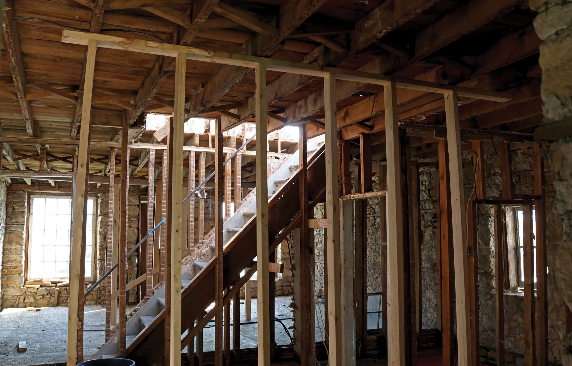 The interior staircase was still intact, but temporary framing was being used to support the second storey, while work was being done to replace the roof. Inside, the plaster was gone and the stone walls were exposed. Outside, stone and bricks that were once part of the chimney formed a pile on the lawn.