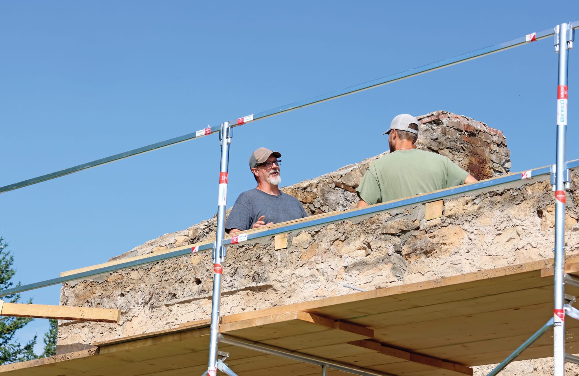 “Basically, every piece of wood is coming out, and just the foundation and stone walls are staying,” he said between cutting new boards and discussing plans with framers on site.