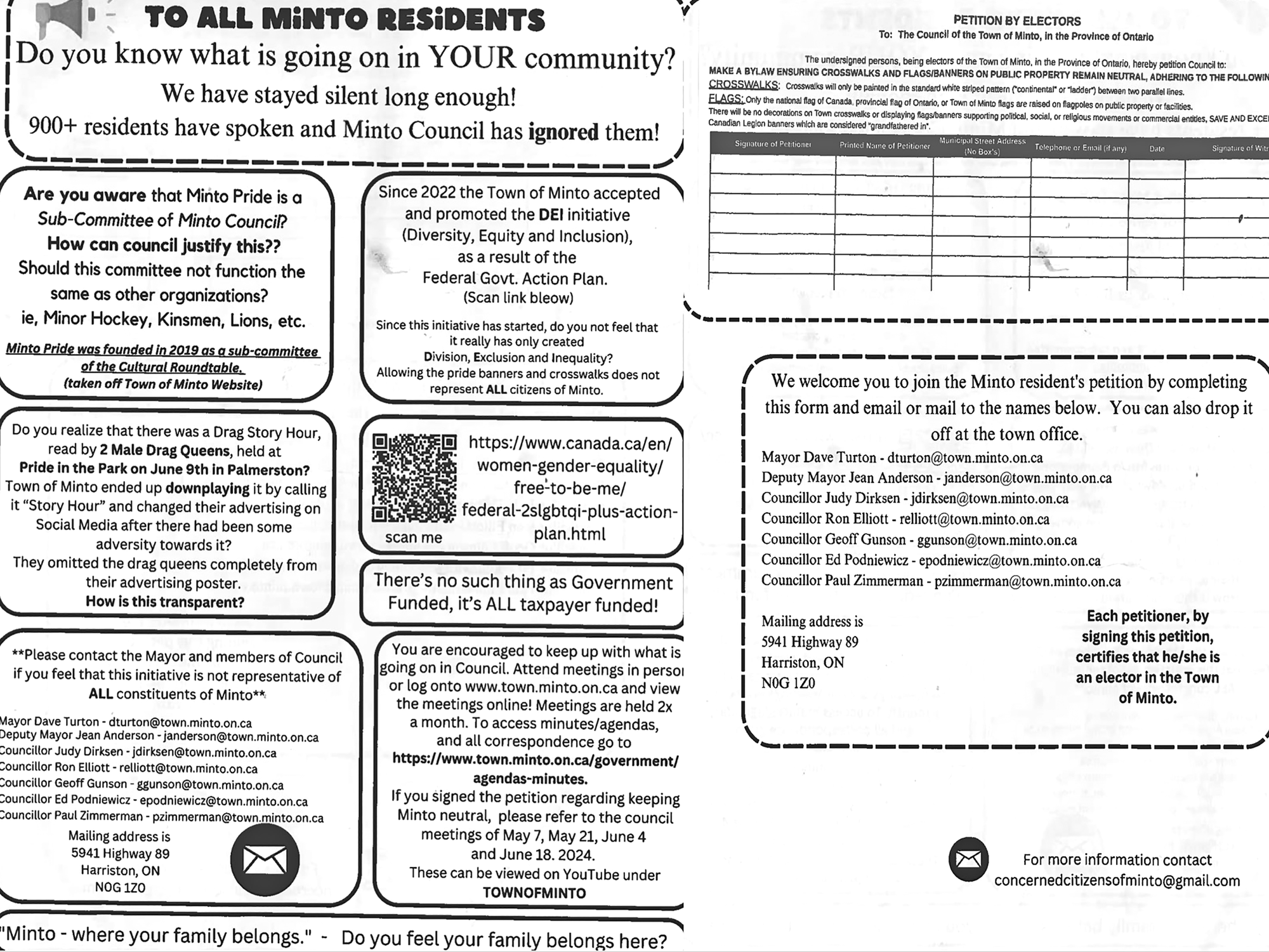 It states "Minto council has ignored" the "900-plus residents" who signed a petition supporting a “bylaw ensuring crosswalks and flags/banners on public property remain neutral.”
