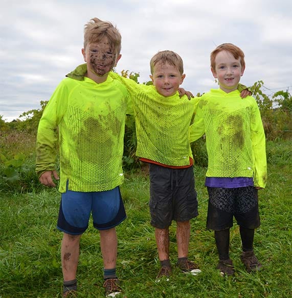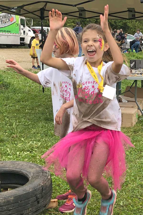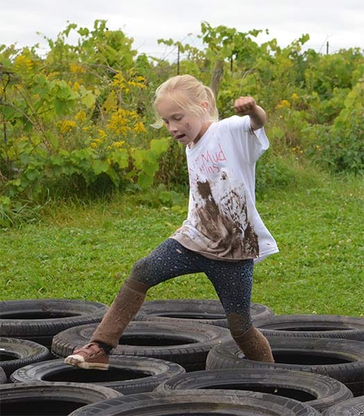 Kaitlyn Countryman slides towards the finish line after completing the “mini mudster” obstacle course on Sept. 14 at the Mudmoiselle event organized by the Canadian Cancer Society.Noah Gilchrist, 6, his brother Easton, 5, and their cousin Benjamin Braconnier, 6, had fun completing the mini mudster obstacle course at the Mudmoiselle event on Sept. 14.Lily Ehgoetz and her teammates from Stratford celebrate at the finish line.A mini mudster tackles the tire obstacle on her second time around.