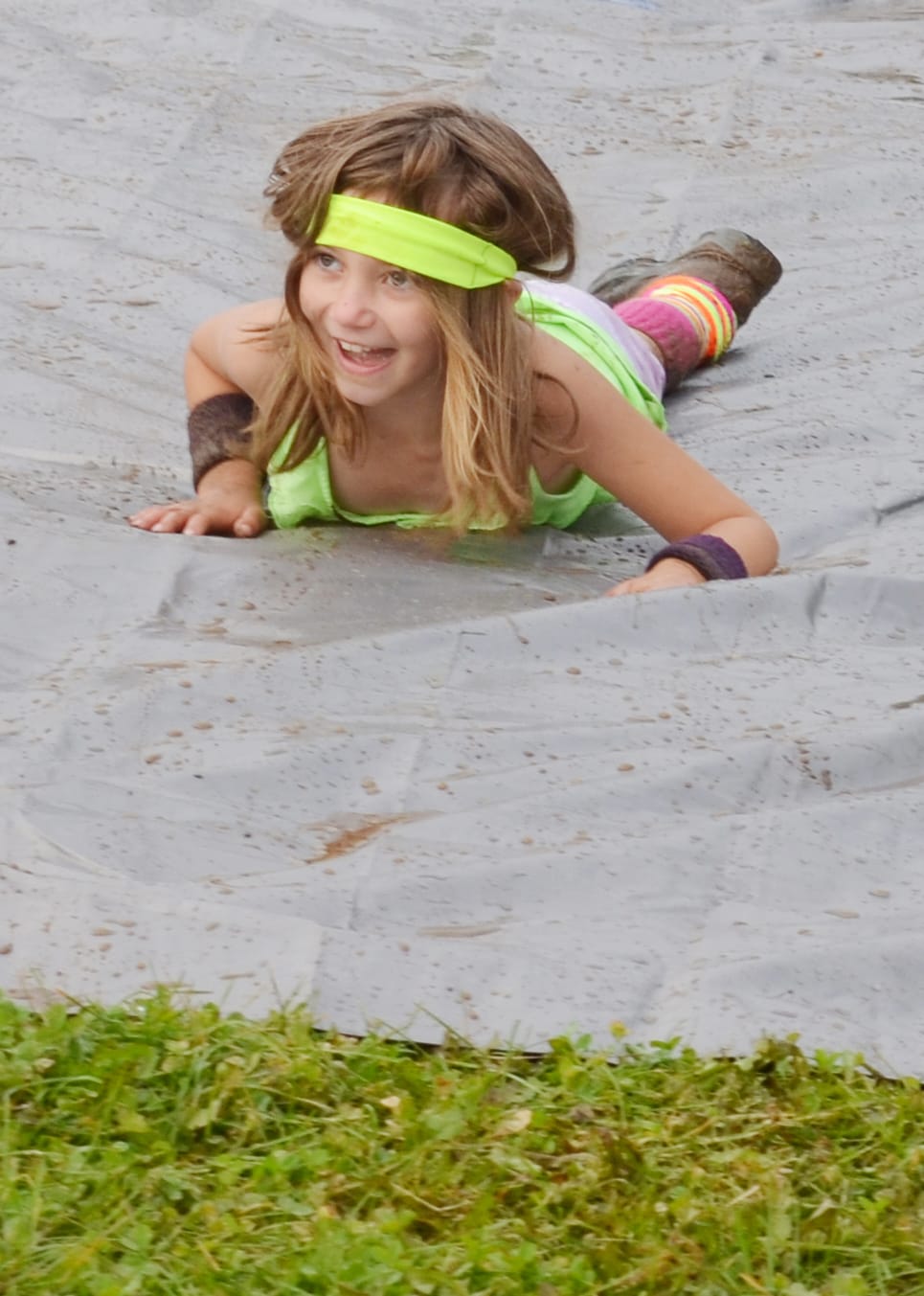 Darby Kurtman, 4 slides towards the finish line after completing the “mini mudster” obstacle course on Sept. 14 at the Mudmoiselle event organized by the Canadian Cancer Society.