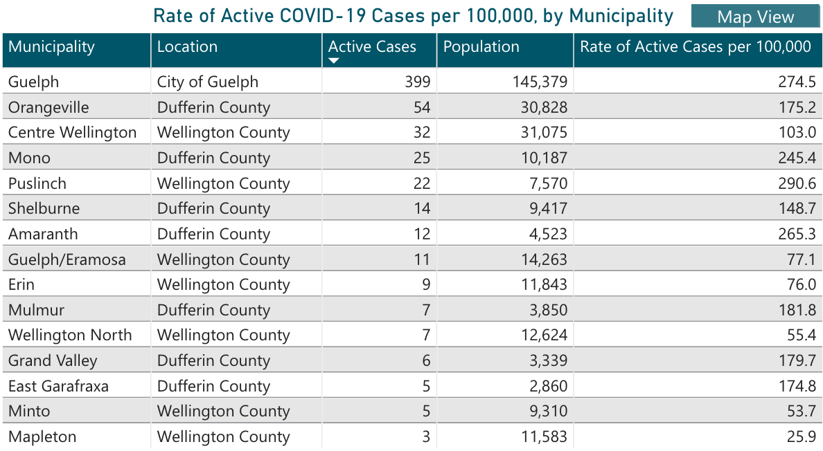 Guelph had 175 new cases over the weekend and now has 399 active cases, up from 235 last week.