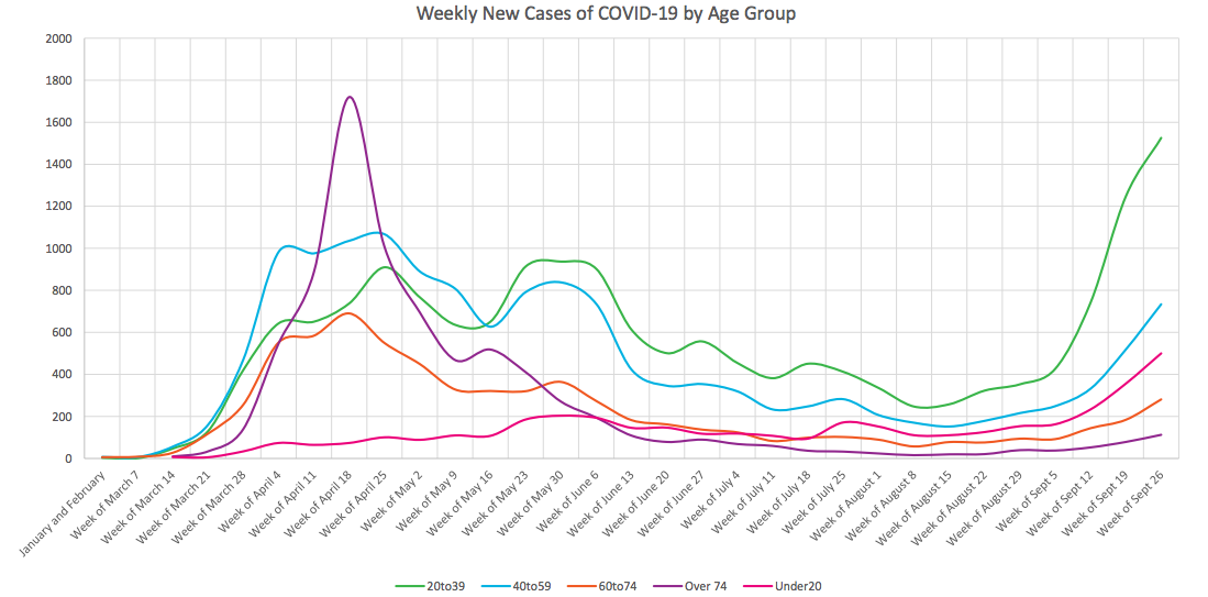 Since the first week of September, the data shows an increase in cases across the board, with the most significant increase in the 20 to 39 age group.