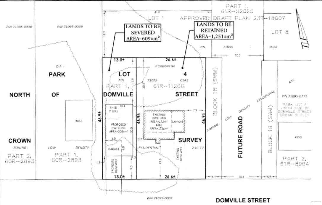 The special provision in the zoning bylaw requires lot area be at least 1,852 square metres, whereas the proposed area for the severed lot is 609 square metres and the proposed area of the retained lot is 1,215 square metres. The provision also requires lot frontage be at least 25.6 metres, whereas the proposed frontage for the severed lot is 13 metres.
