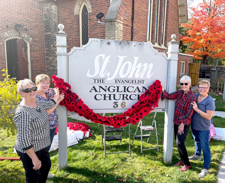 Poppy project – Members of St. John Anglican Church were working on the Poppy Project on Oct. 23. The project began at the Elora church last year, when the group created banners made of more than 7,000 hand-knitted or crocheted poppies to hang on the church for Remembrance Day. This year the project has expanded, with an additional 3,000 poppies, and banners will also be hung on the local library, several businesses and other locations around town.