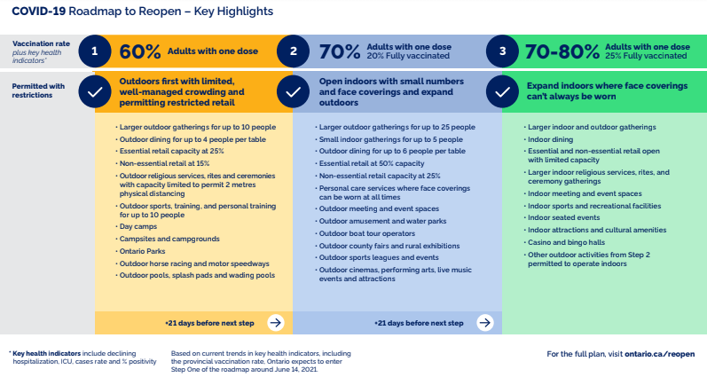 The province's three-step reopening plan doesn’t have a definitive start date, but health minister Christine Elliott said it should commence “around the week of June 14” when its estimated 60 per cent of the province’s adult population will be vaccinated with at least one dose.