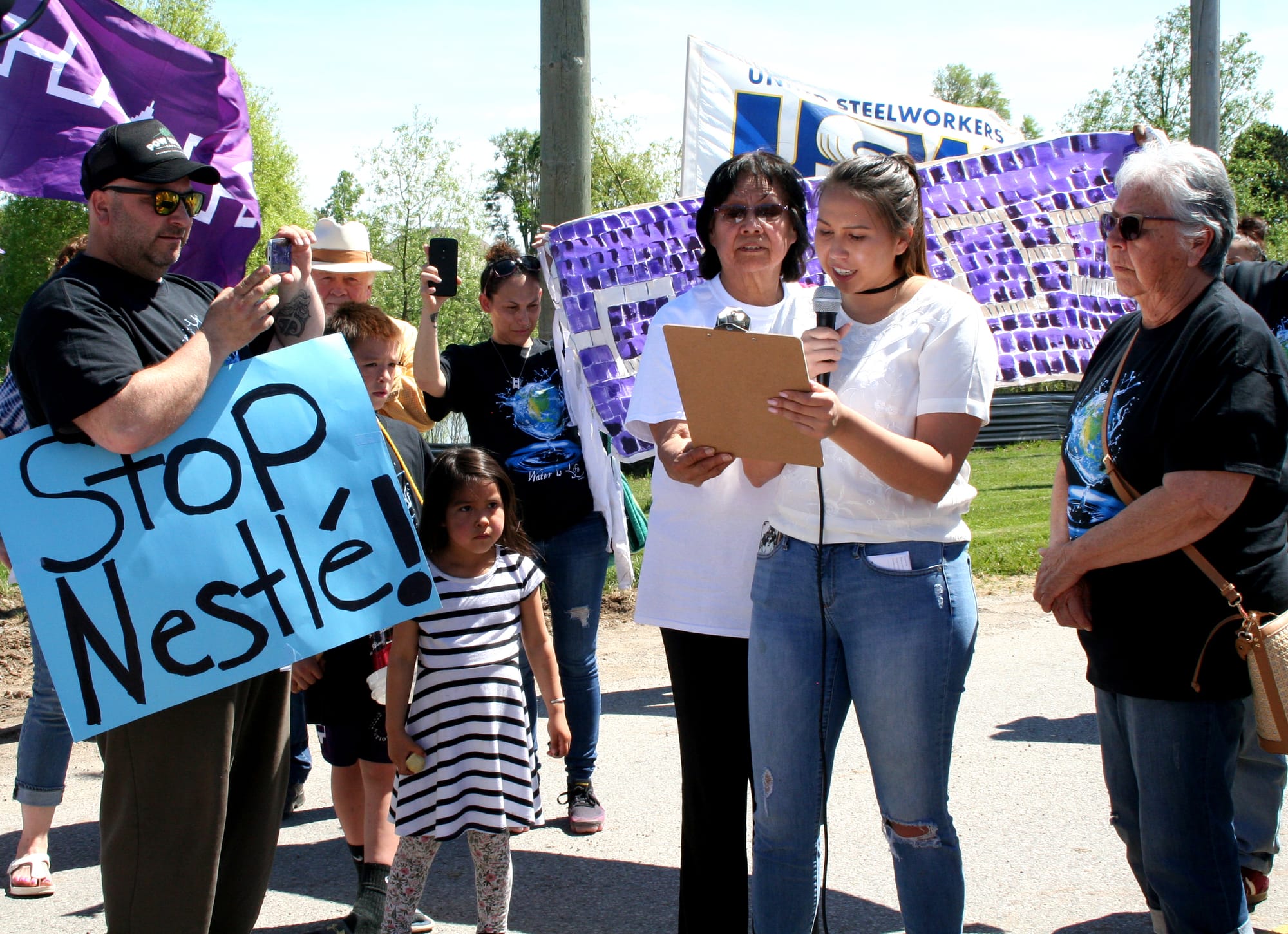 Protestors read a cease and desist statement issued from the Six Nations Iroquois Confederacy Council of the Grand River Territory and the Haudenosaunee Confederacy to Nestlé Well Site 101 Brock Road South Aberfoyle.