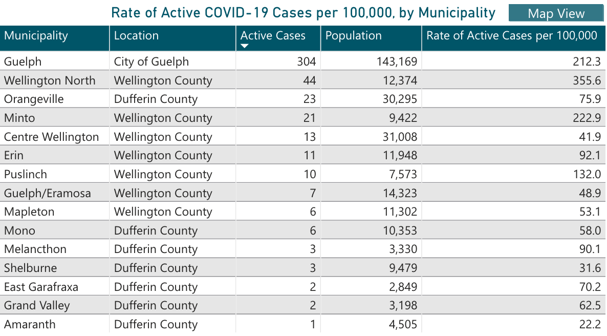 The City of Guelph has the most cases in the region (95 new and 304 active, with four hospitalizations).