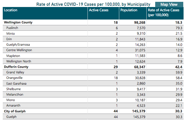 Active cases in both Guelph and Dufferin County are sitting at 44 and 29, respectively.