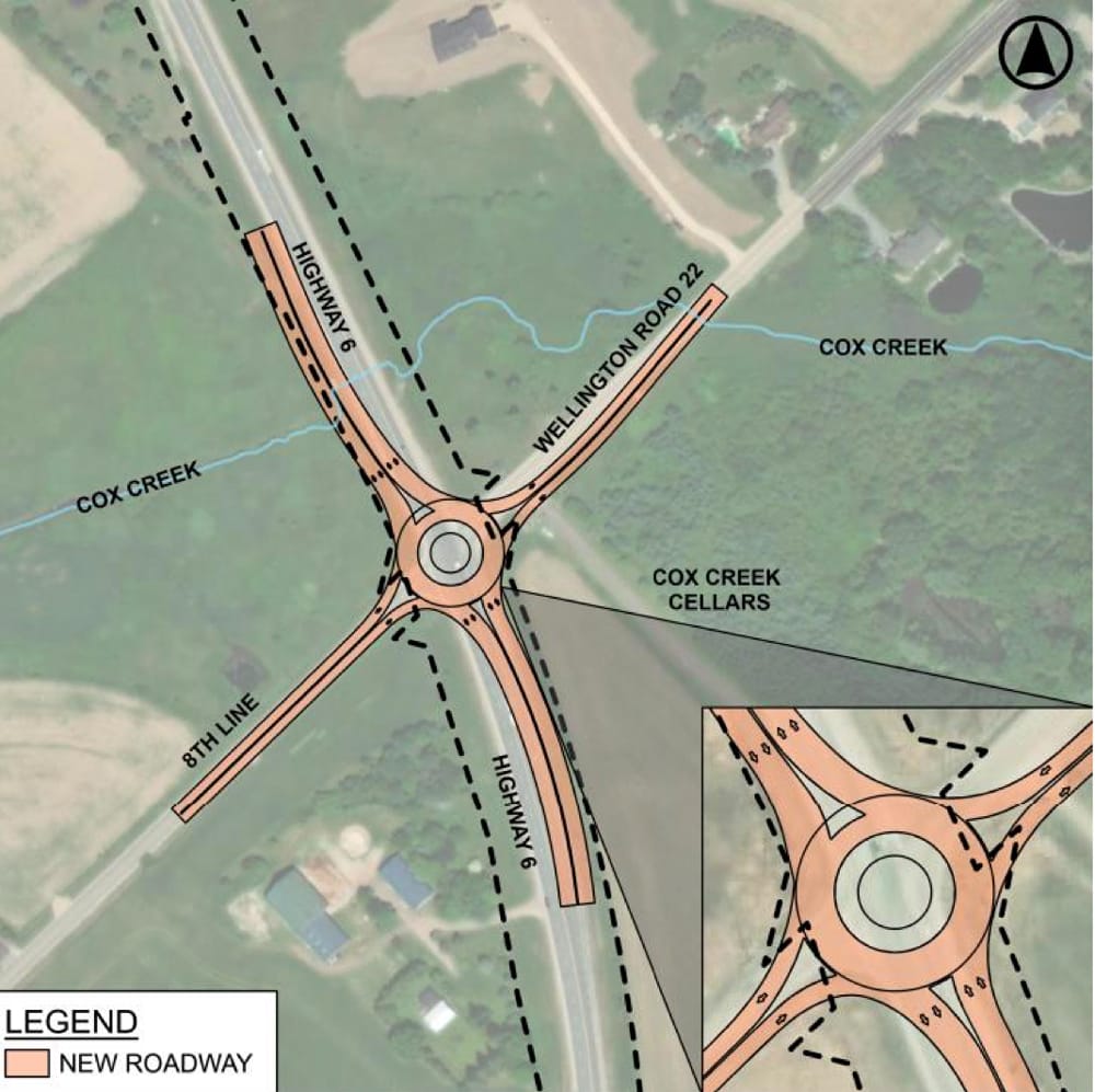 The plan involves constructing a “modern roundabout” designed to accommodate both farm equipment and tractor trailer vehicles, and changes to the “horizontal alignment” of both Highway 6 and Wellington Road 22 and 8th Line, it says.