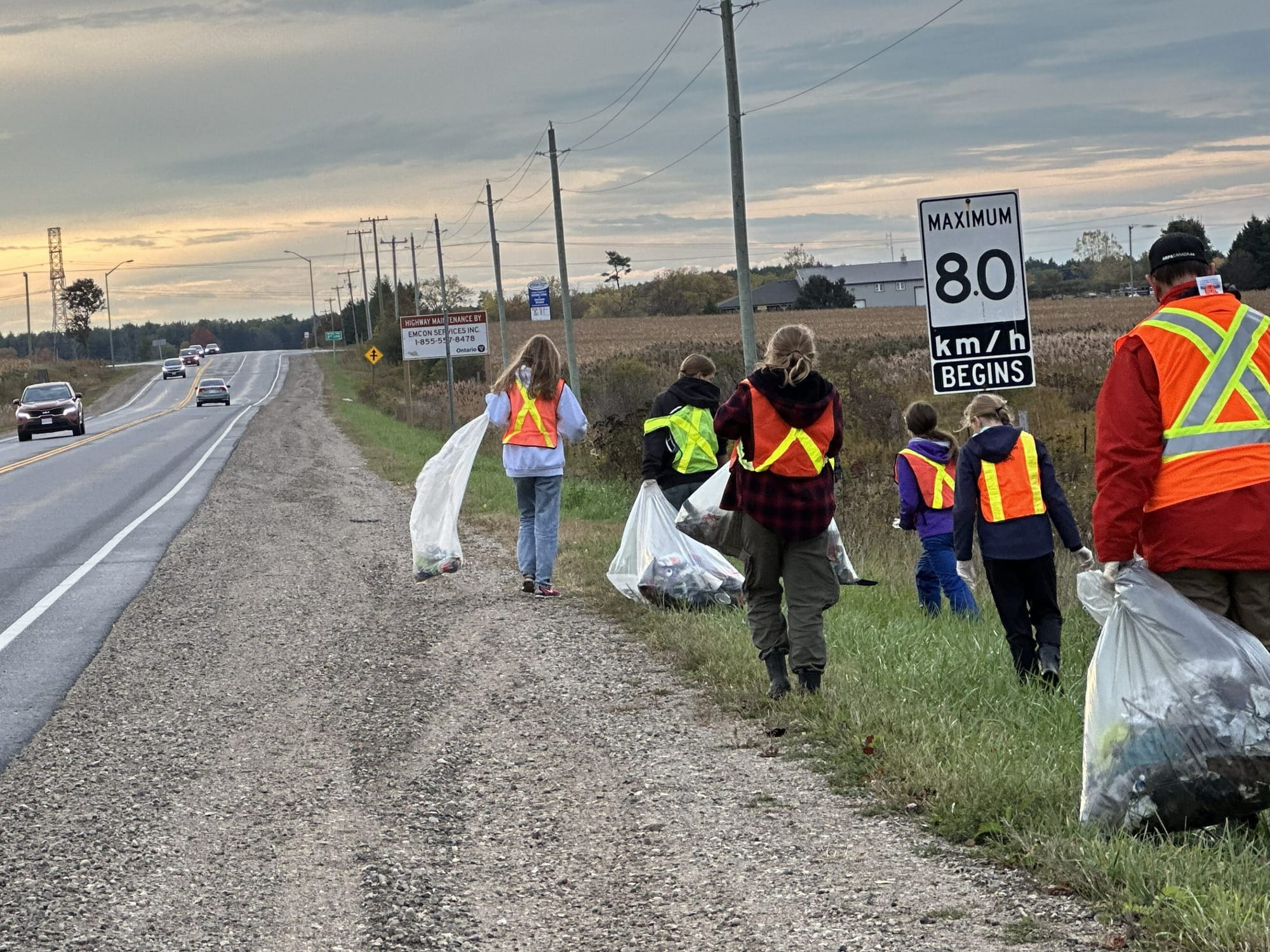 CENTRE WELLINGTON – Once more the students of Maranatha Christian School joined the Fergus Lions Club for an annual roadside cleanup on Oct. 18. The day was sunny and warm as 30 students, along with their teacher volunteers and principal, teamed up with members of the Fergus Lions to clean up the southern approaches to the town. Several bags of trash were collected and than picked up by staff from Emcon – a highway management company. Following the event, the students were treated to snacks provided by Tim Hortons on Tower Street South. The Lions Club sent a big thanks to management and staff for their generosity and also to Elliott Bus Lines for providing transportation. Principal Richard Hoeksema was presented with a cheque for $800 by Lions president Margaret Murray as a “thank you” to the school for its assistance. Principal Hoeksema commented this was his 17th annual cleanup with the Lions – a partnership proving the test of time. TOP: Lions president Margaret Murray presents principal Richard Hoeksema with the $800 cheque. ABOVE: A team of students pick up garbage on Highway 6 exiting town.