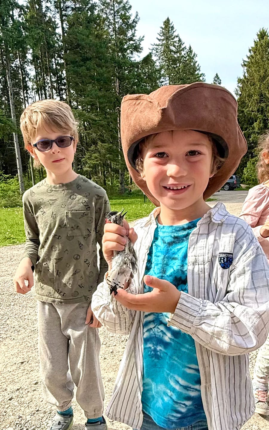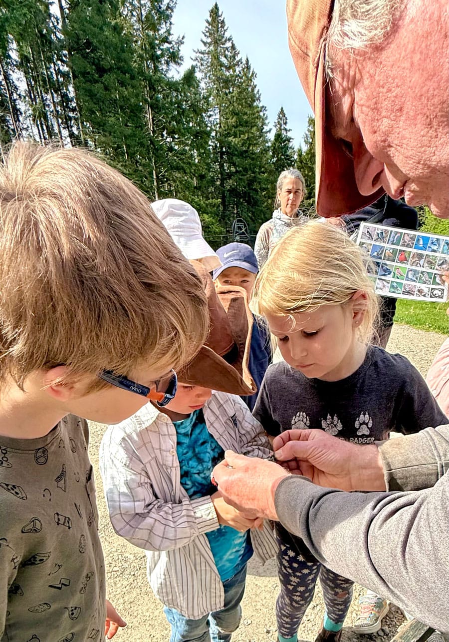 Arrow Anderson demonstrates how to hold a bird (male downy woodpecker) while friend Trystan Wright looks on.