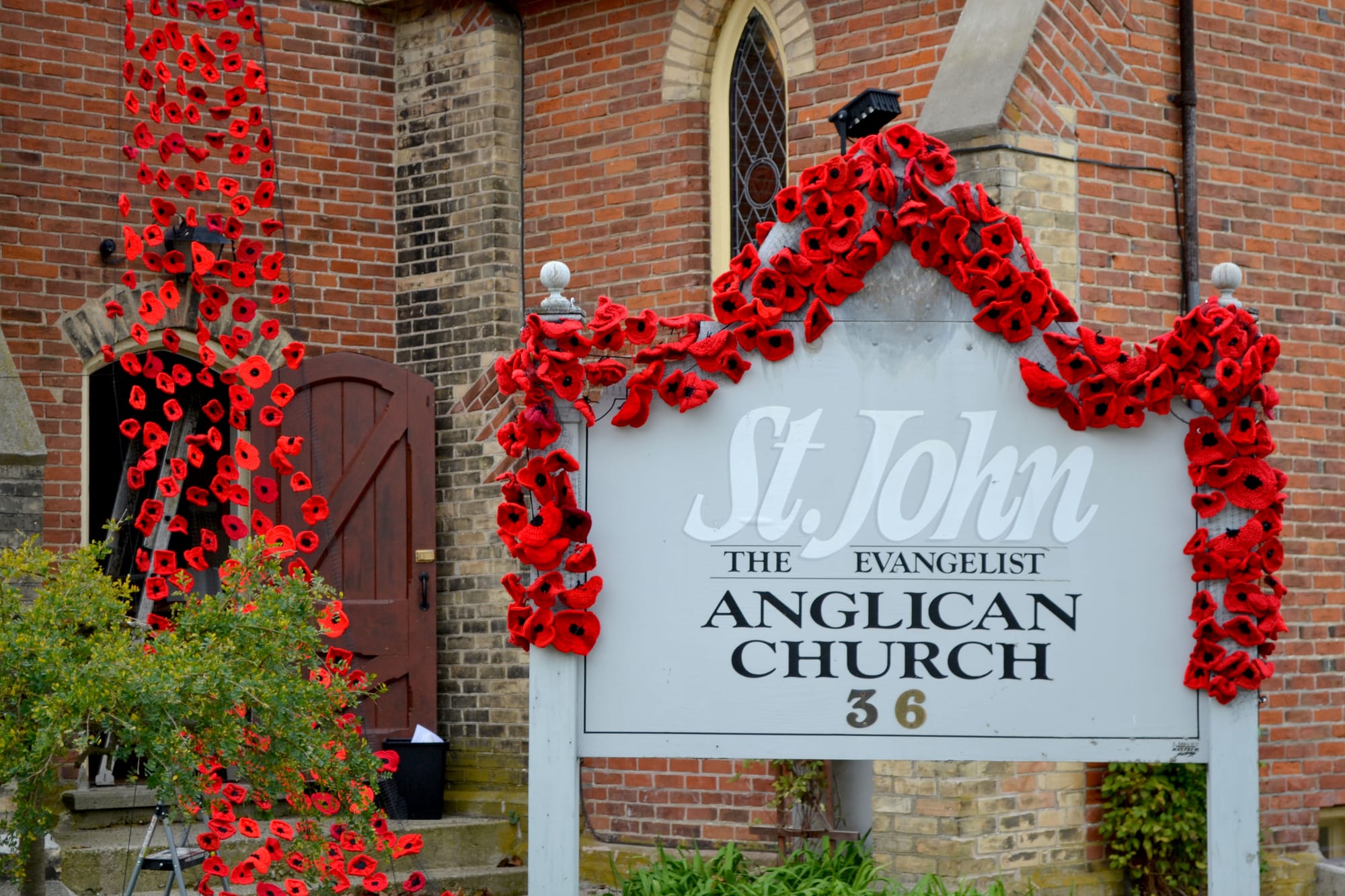 ELORA – Passersby will see thousands of knitted poppies cascading from the windows of the St. John Anglican Church steeple over the next couple weeks.