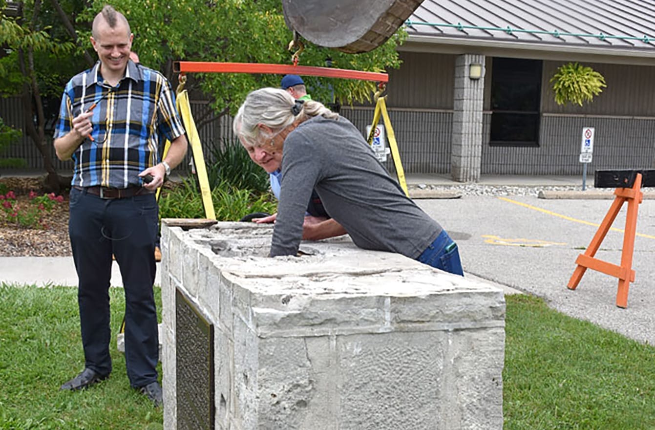 It took many of the 30-some folks who turned out for the ceremony back to the ceremony in 2002, when the cairn that stood for 40 years at Marden Public School, was relocated to the library grounds.