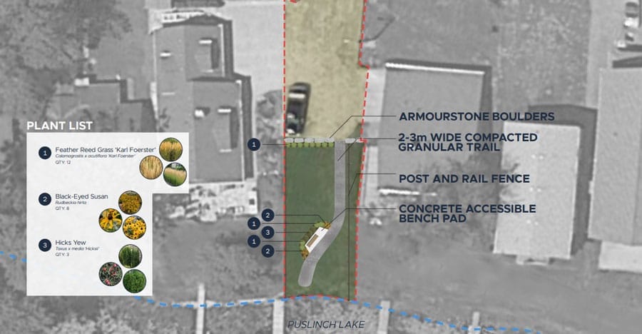Puslinch Township is moving forward with a plan to install a pathway, bench and small garden at the public right-of-way between Travelled Road and the lake, providing pedestrian public access to the water.