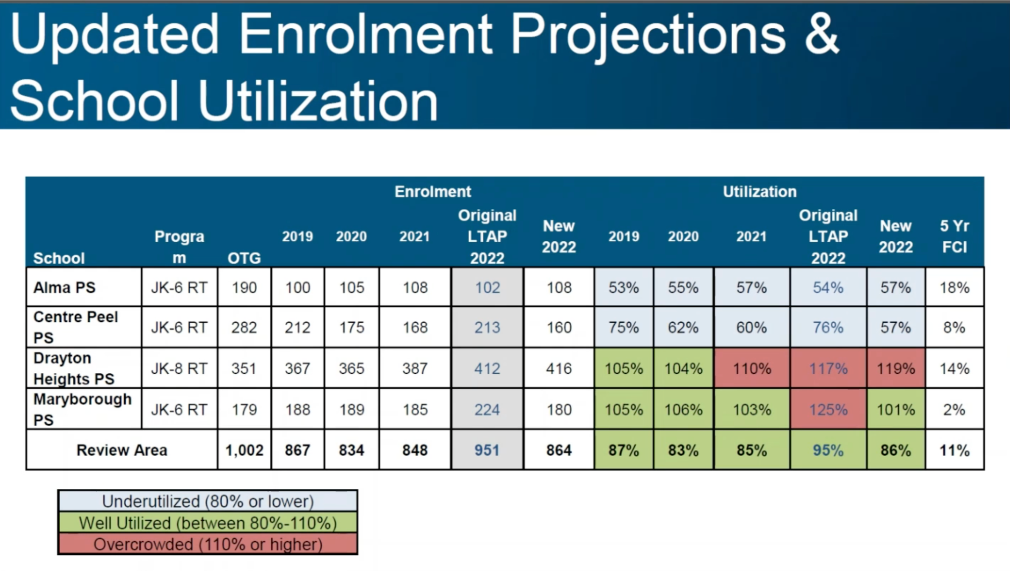 She also provided trustees with an update on enrolment projections and school utilization which noted Alma Public School was under-utilized with 80 per cent or lower enrolment while Drayton Public School was being overcrowded with 110% enrolment.