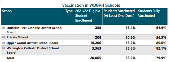 In elementary schools falling within the WDGPH catchment area, there are an estimated 4,647 eligible elementary school students at least 12 years-old who are vaccinated with two doses; 259 with only a single dose; and 1,274 students who have not yet received a single dose.