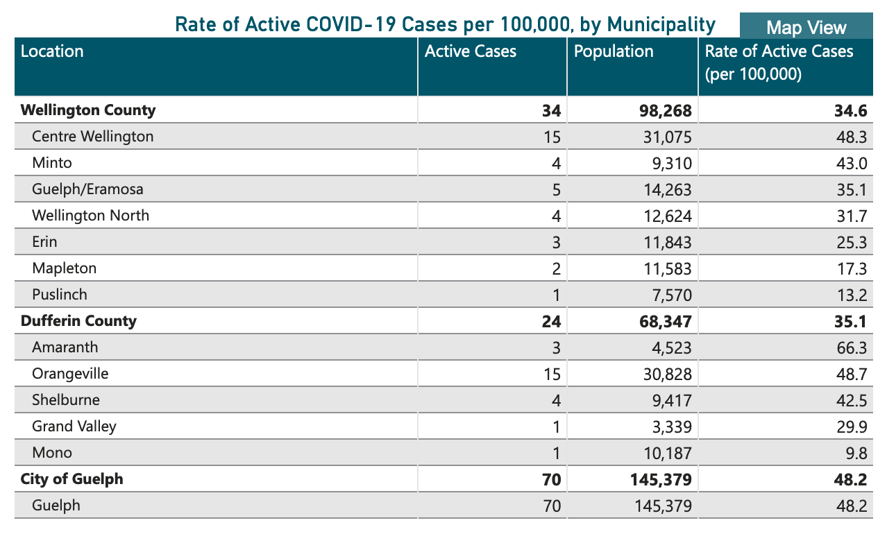 Active cases in Guelph and Dufferin County are sitting at 70 and 24, respectively.