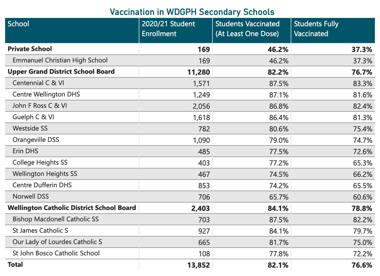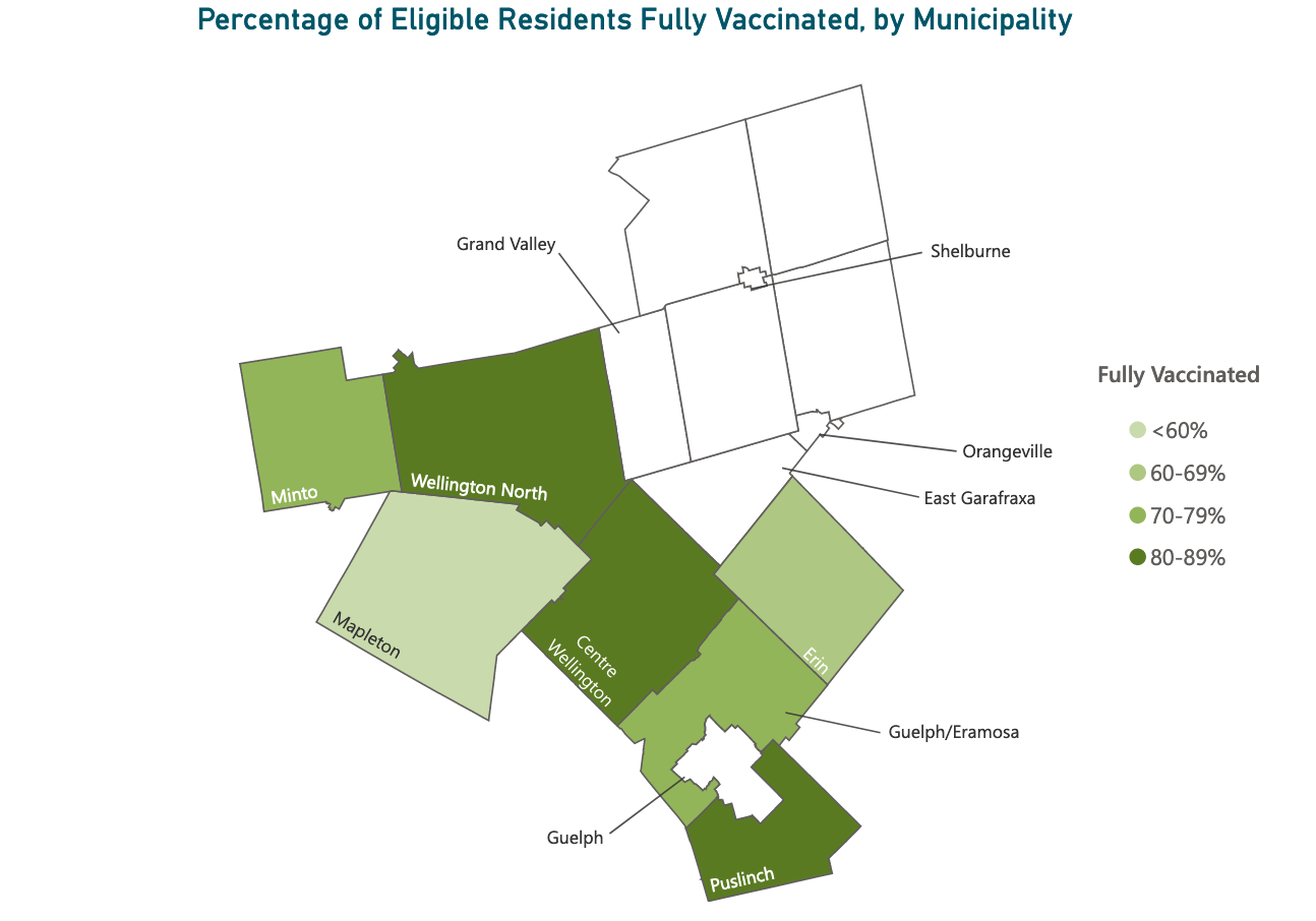 According to WDGPH data tracking vaccination uptake across county municipalities, Centre Wellington has the highest proportion of fully vaccinated residents, with 80-89% of its 27,038 residents having received two doses.