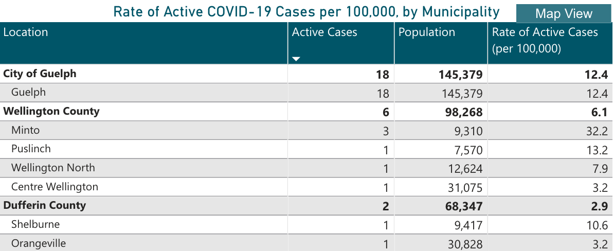 Active cases in Guelph have declined to 18 and Dufferin County has two active cases.
