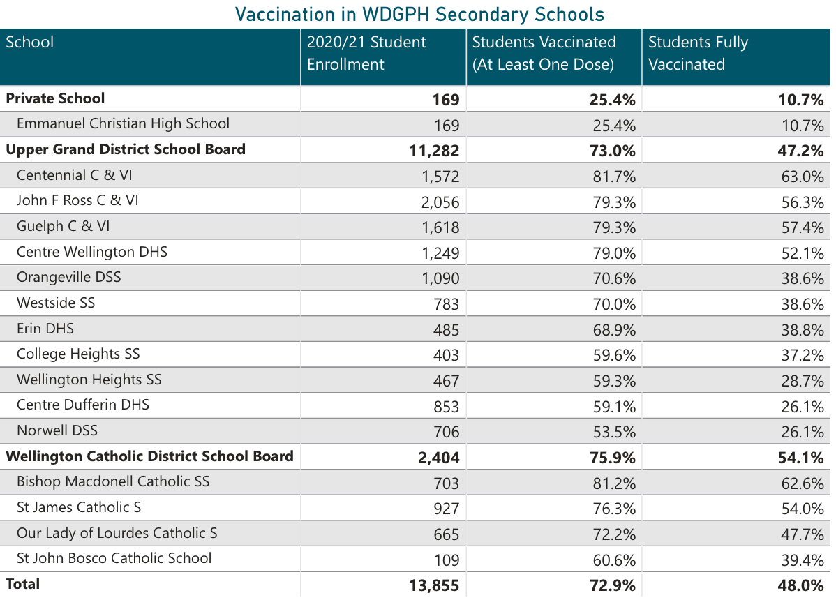 Across the region, 72.9% of high school students have received at least one vaccination dose, while 48% are fully vaccinated. Results for individual boards and schools are included in the table below.