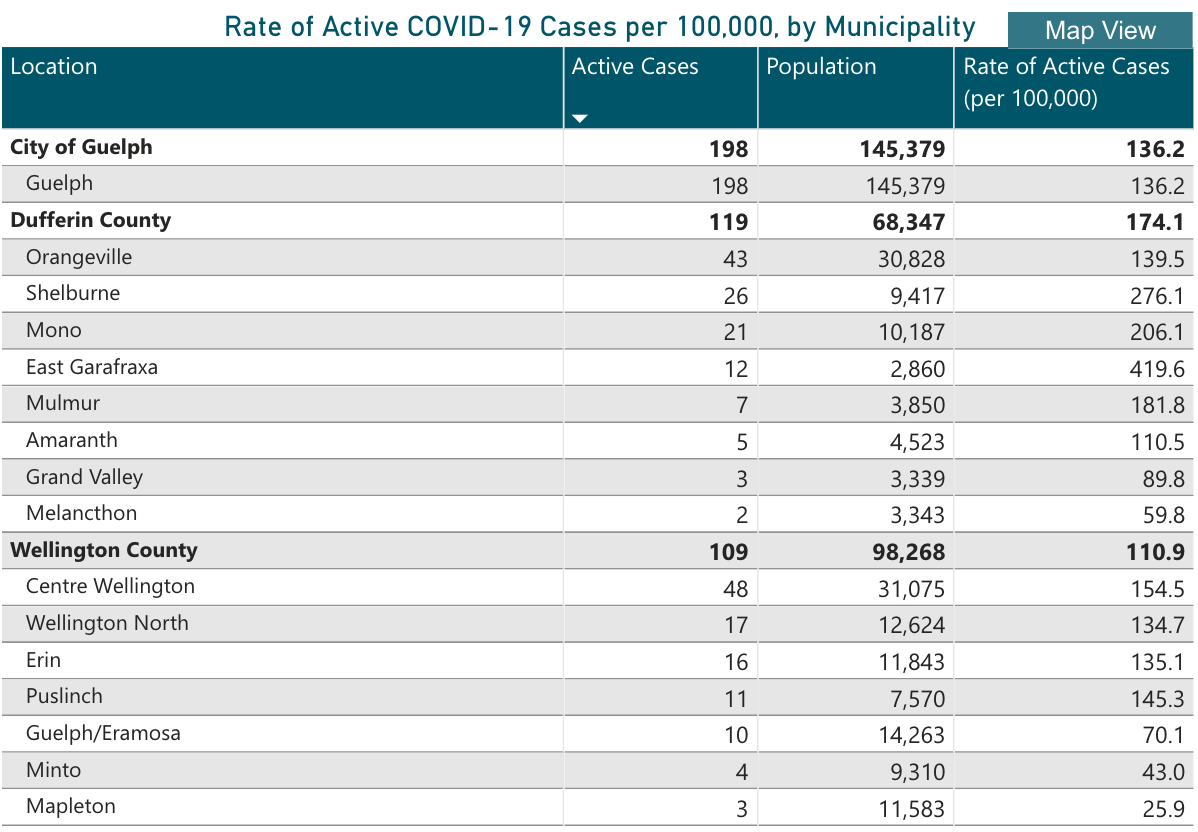 Guelph had 45 new cases over the weekend and now has 198 active cases, down significantly from 318 last week.