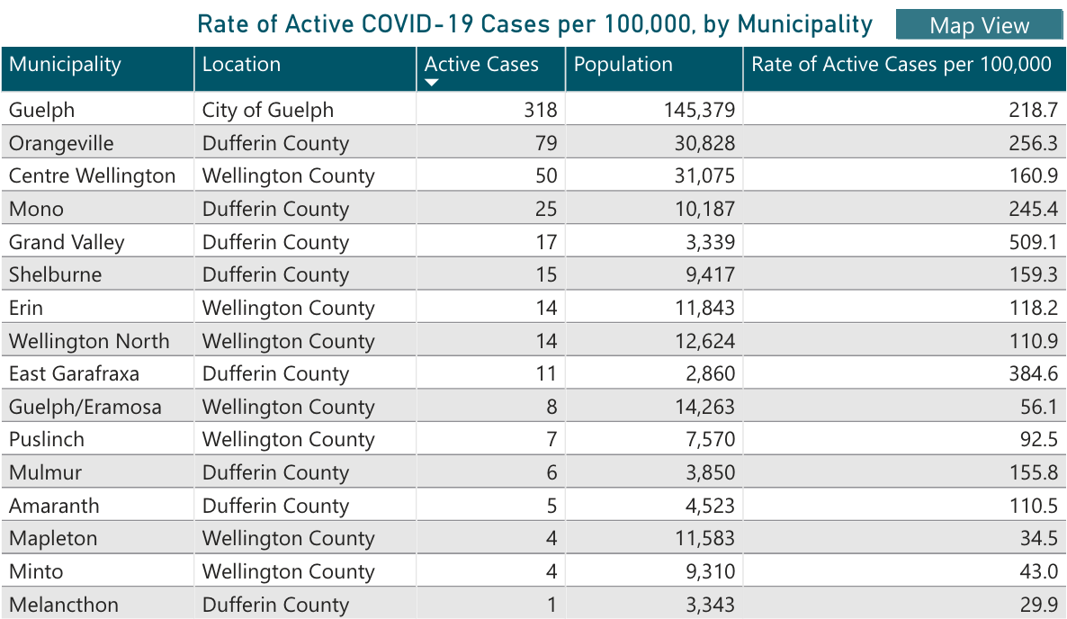 Guelph had 114 new cases over the weekend and now has 318 active cases, down from 386 last week.