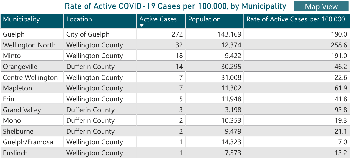 There are currently 21 active cases in Dufferin County and 272 in Guelph.